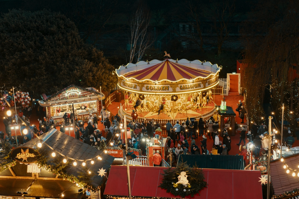 In the heart of Edinburgh’s historic centre, with views of the Edinburgh Castle and Scott Monument, East Princes Street Gardens hosts one of the most picturesque Christmas markets around. Stroll through 70 stalls featuring everything from local handmade gifts to international delights. The LNER Big Wheel stands at 46 metres, offering a unique perspective of Edinburgh’s sparkling holiday lights, while the Around the World Star Flyer gives you a bird’s eye view of the entire festive scene.